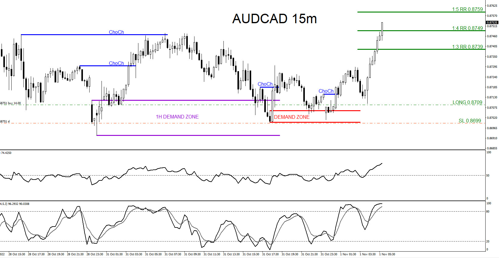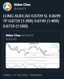 On October 31 2022 I posted the AUDCAD trade setup on social media @AidanFX “ LONG/BUY AUDCAD at 0.8709 Stop Loss 0.8699 TP 0.8739 (1:3RR) 0.8749 (1:4RR) 0.8759 (1:5RR)“