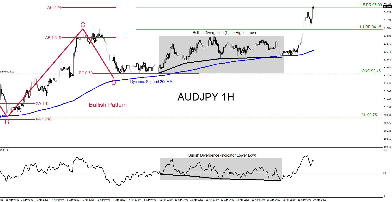 On April 6 2022 there were several market patterns that signalled the AUDJPY pair would move higher. Confluence trading is a combination of two or more trading strategies/techniques that come together and form a high probability buy/sell zone in a certain area in the market. Market patterns (Elliott Waves, Harmonic, Head and Shoulders etc.), price action analysis (Support & Resistance, Supply & Demand Zones, Candlestick analysis etc.) and indicators (RSI, Moving Average, Stochastic etc.) are technical strategies/techniques used when trading a confluence setup. The charts below show a confluence trade setup that signals a trader on which side to take the trade.