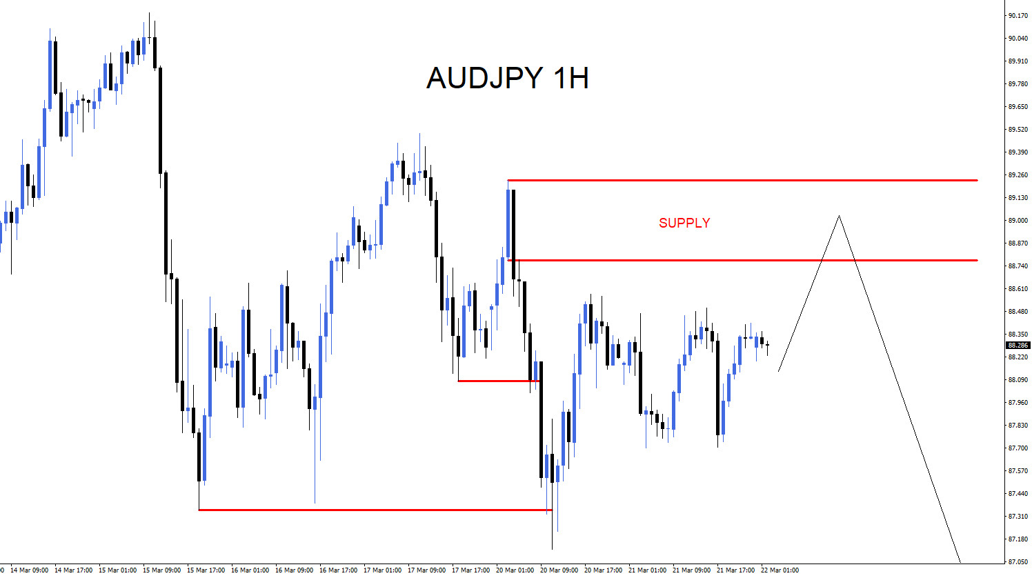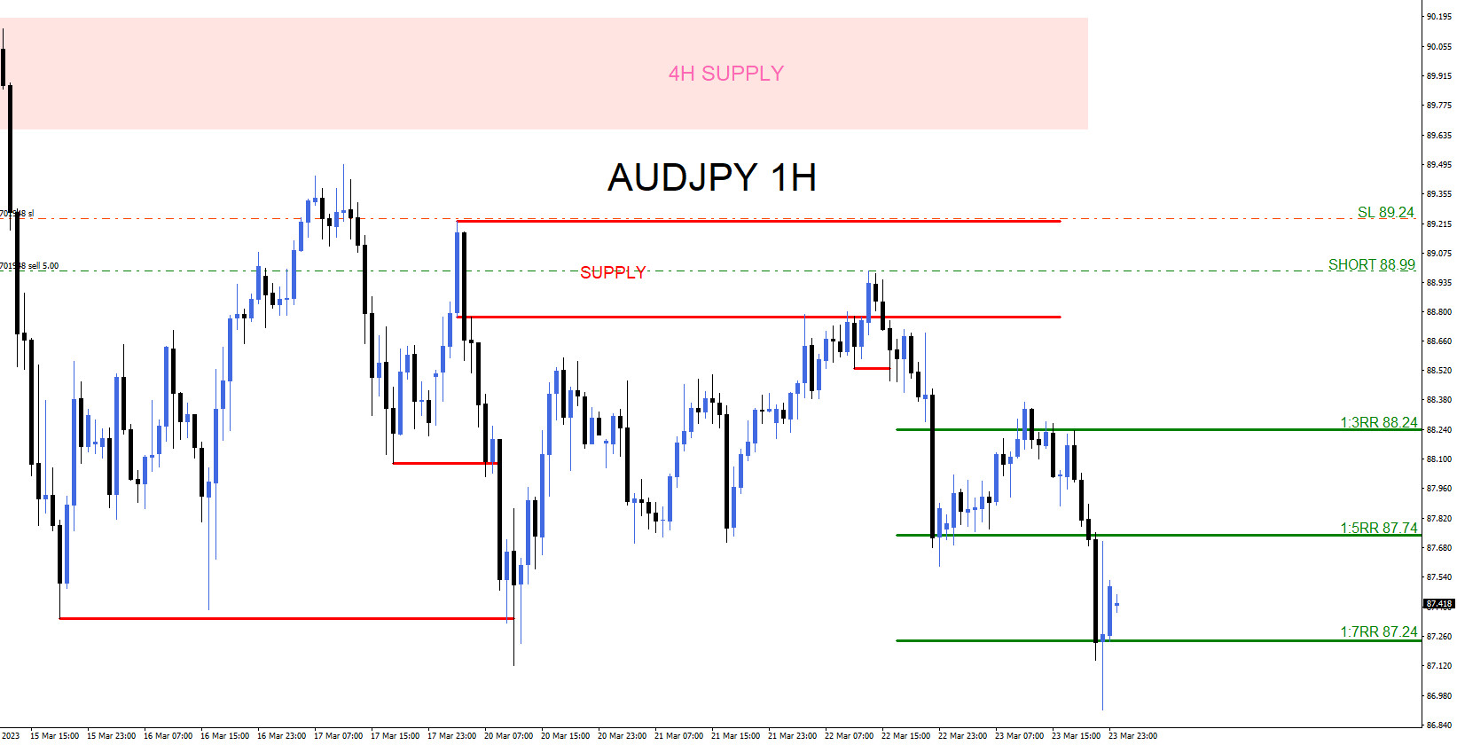 On March 21 2023 I posted the AUDJPY 1 hour chart on social media @AidanFX calling for the pair to sell off on the pullback to the supply zone (red) and continue the trend lower and make a newer lower low. Also on March 22.2023 I posted the SELL entry live on social media > AUDJPY SHORT @ 88.99 Stop Loss 89.24 Targets 88.24 (1:3RR) 87.74 (1:5RR).