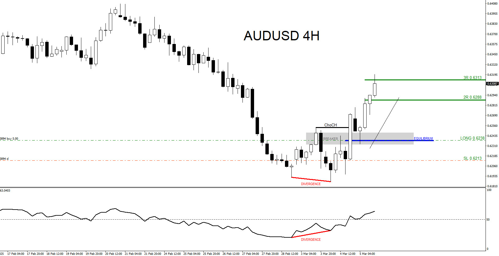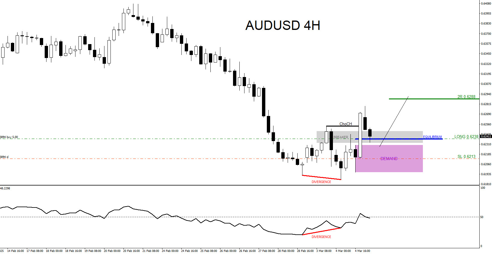 On March 4 2025 I posted the AUDUSD BUY setup chart below. In the chart below, price clearly broke above the black CHoCH/Change of Character level signalling a momentum shift to the upside. Added confirmation of an upside shift was the divergence pattern (Red) that also formed. The buy setup was to patiently wait for price to return lower to the Breaker Block (Gray), Demand Zone (Pink) or the equilibrium level (Blue) for entry with stops below the strong up/bullish candle that broke above the CHoCH level.
