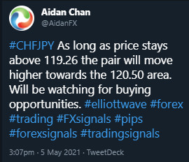 On May 5 2021 I posted on social media @AidanFX “CHFJPY As long as price stays above 119.26 the pair will move higher towards the 120.50 area. Will be watching for buying opportunities” and “Watch for CHFJPY BUY on break above 119.76 with stops at 119.26 targeting the 120.26 – 120.50 area.”