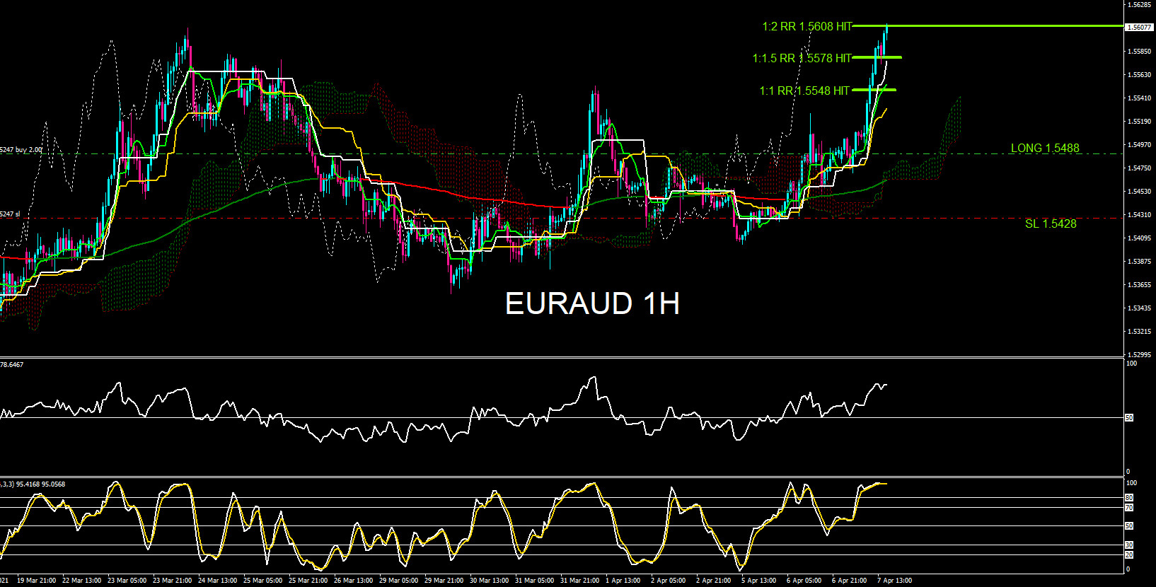 The chart below was also posted on social media @AidanFX April 6/2021 showing that EURAUD crossed above the Ichimoku Cloud signalling traders a bullish bias outlook. Price broke above the cloud then did a pullback to retest the top of the cloud and reacted with a move higher. Price also respected and bounced off the white Kijun-sen line which was all the signals I needed to squeeze the trigger and open a LONG position expecting a rally higher.