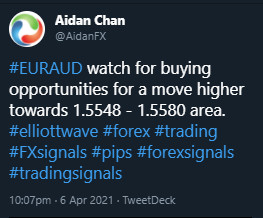 On April 6/2021 I posted on social media @AidanFX “EURAUD watch for buying opportunities for a move higher towards 1.5548 – 1.5580 area.“