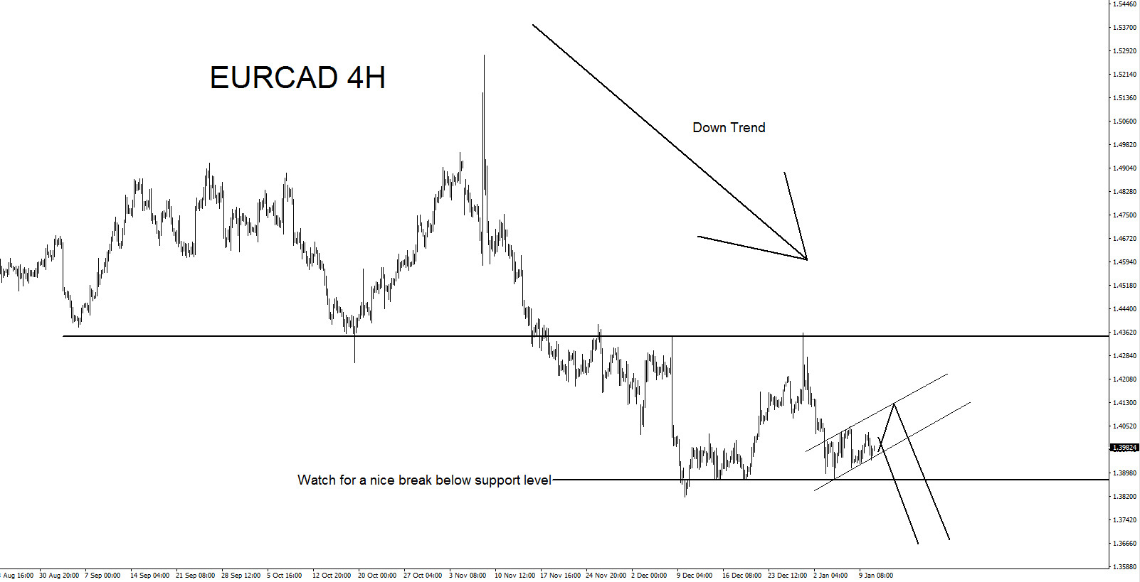 EURCAD 4 Hour showing clear resistance and support levels. Break below lower channel trend line can possibly signal that down trend will continue and a clear break below support level will confirm that the pair will push lower.