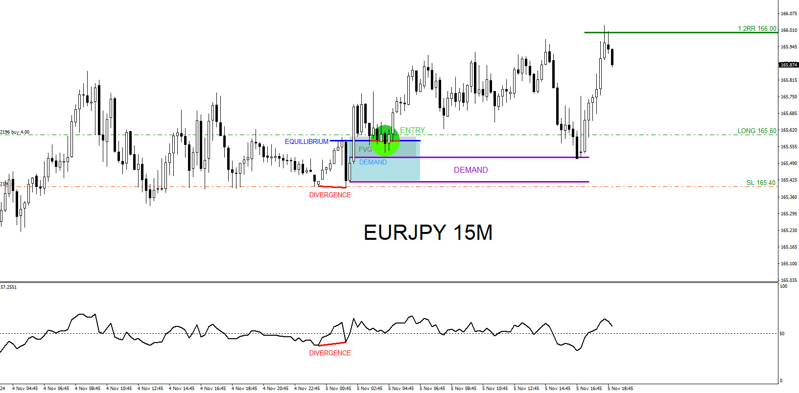 On November 4 2024 I posted on social media @AidanFX the EURJPY BUY entry with the 1 hour chart. The chart illustrated for traders that price and indicator oscillator formed and terminated a bullish divergence pattern (Red) signalling upside. The pair pushed higher then quickly retraced lower and entered a bullish demand zone (Blue box) and a bullish FVG/Fair Value Gap (Gray box). Seeing all these bullish signals play out in real time allowed me to entered the LONG trade with confidence.