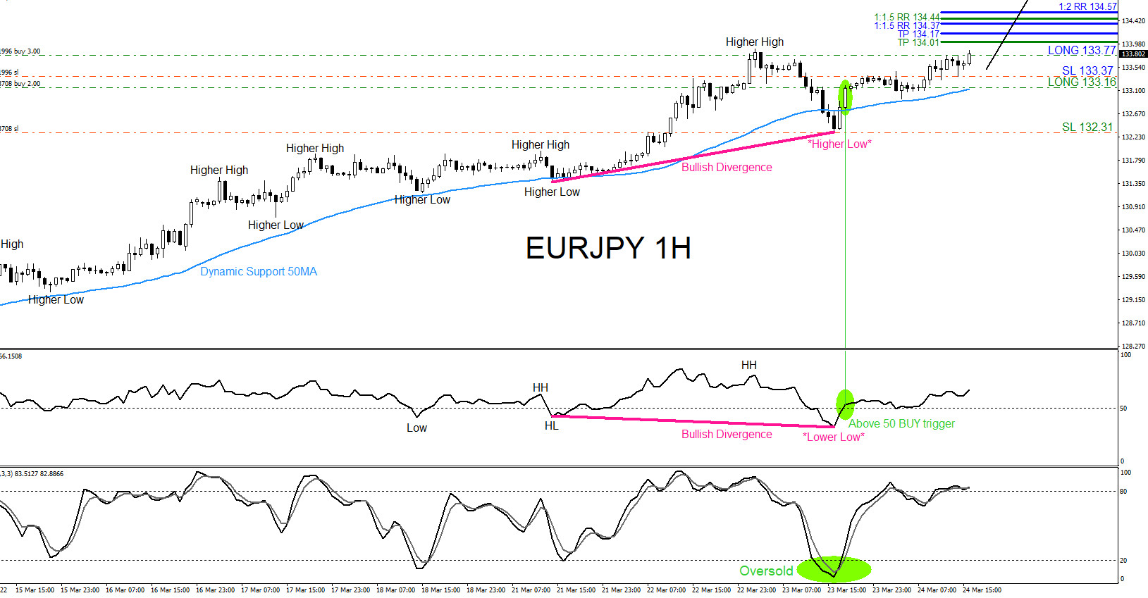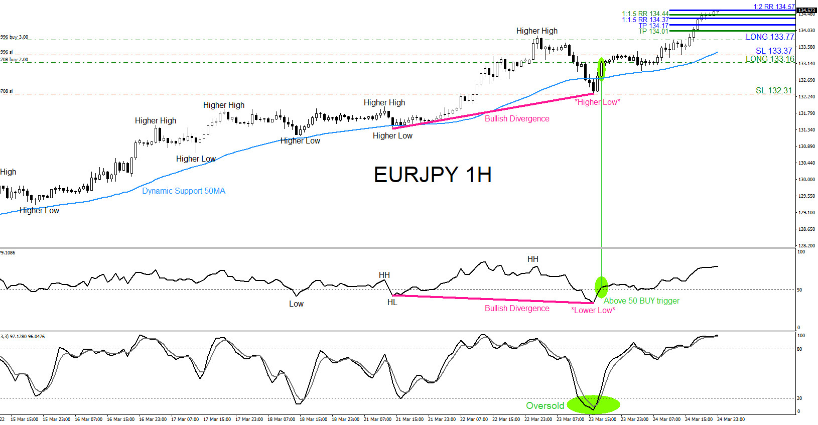 On March 23 2022 I posted on social media @AidanFX “EURJPY Watch for buying opportunities against 132.31 stops for a move higher towards the 134.00-134.50 area“ The EURJPY 1 Hour chart below was also posted on social media showing the BUY scenario. The pair has been trending up forming a higher high/higher low sequence. At EWF we always encourage traders to trade with the trend and not against it. Besides the clear up trend another visible factor was both price and the RSI indicator formed a bullish divergence pattern (Pink) signalling an up trend continuation. Added sentiment was price also respected the Dynamic Support 50MA (Light Blue) in this same area. Also the Stochastic indicator was in oversold levels and the RSI indicator triggered BULLISH when it crossed above the 50 level. Entered trade at 133.16 with Stop Loss at 132.31 and looking for rally higher towards the 134.44 target level.