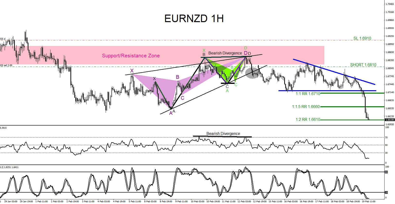 EURNZD 1 Hour Chart February 12 2021 (Support/Resistance Zone & Bearish Divergence)