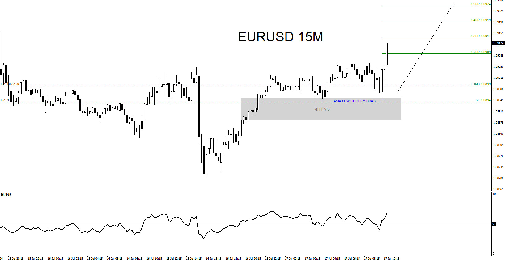 Posted the buy entry on social media @AidainFX July 17 2024. Price swept the Asia low grabbing liquidity and fuelling the upside. Price also tapped the 4 Hour FVG (Fair Value Gap) and reacted with a bounce higher signalling this zone had buyers/bulls waiting. Entered the BUY trade at 1.0899 with a 5 pip tight stop loss at 1.0894. EURUSD moved higher and tagged the 1:5RR target at 1.0924 where I closed the trade for +25 pips +5% gain (Risking 1% on every trade).