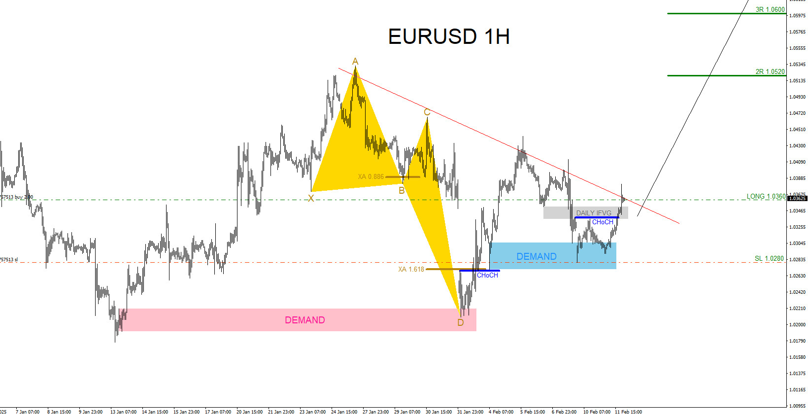 EURUSD 1 Hour Chart February 11 2025 (1st BUY Entry Green)