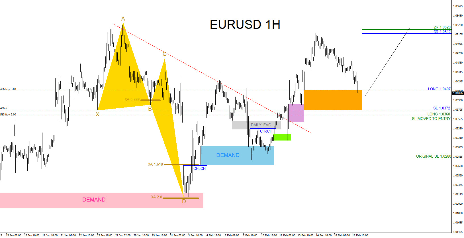 On February 19 2025 I posted on social media @AidanFX the 2nd EURUSD buy setup when price re-traced lower to a demand zone (Orange Box). Also I advised 1st BUY (Green) to be raised to entry and risk free.