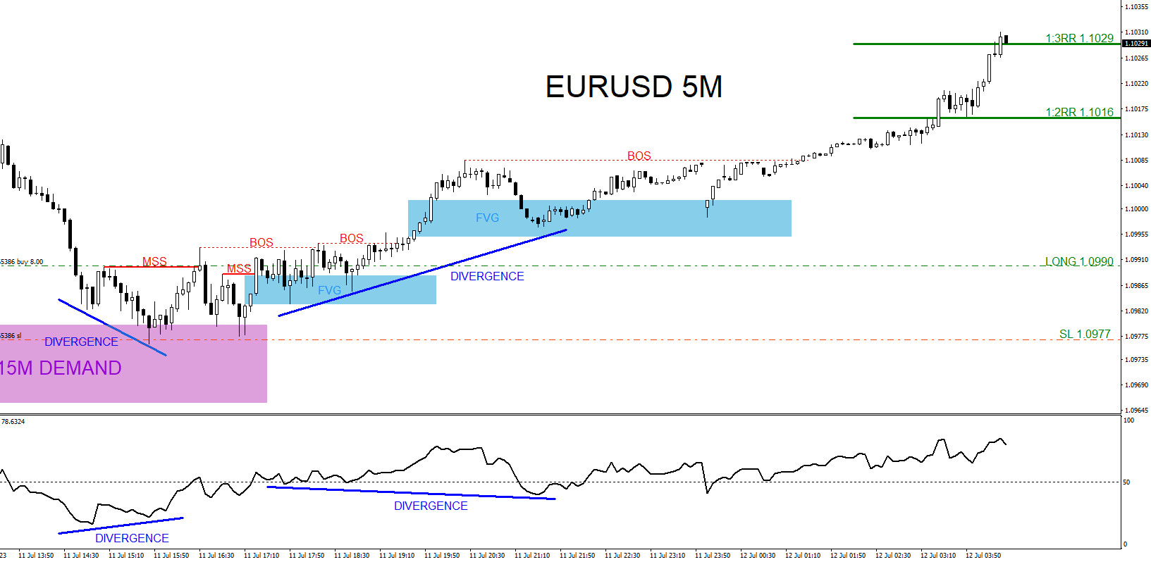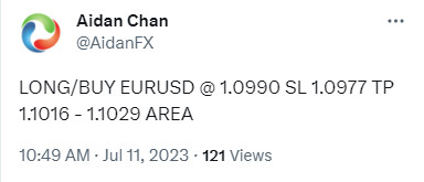 On July 11 2023 I posted on social media @AidanFX ” LONG/BUY EURUSD at 1.0990 Stop Loss at 1.0977 Target 1.1016 – 1.1029 area.”