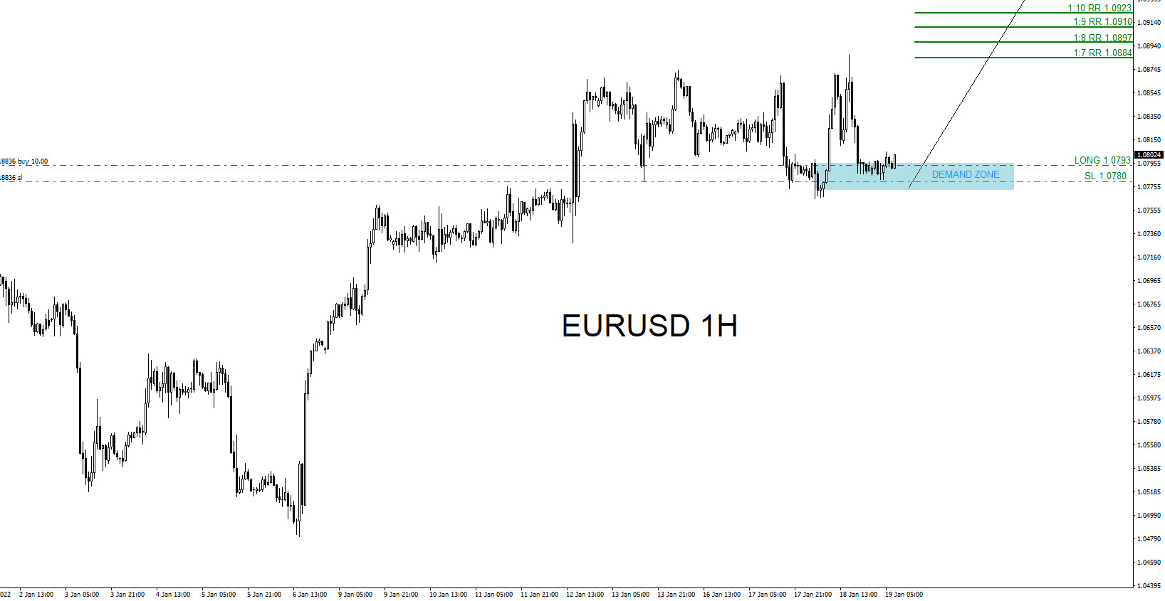 BUY trade entered January 19 2023 at 1.0793 with Stop Loss at 1.0780 looking for move higher to the minimum 1:7 RR 1.0884 target and maximum 1:10 RR target at 1.0923.