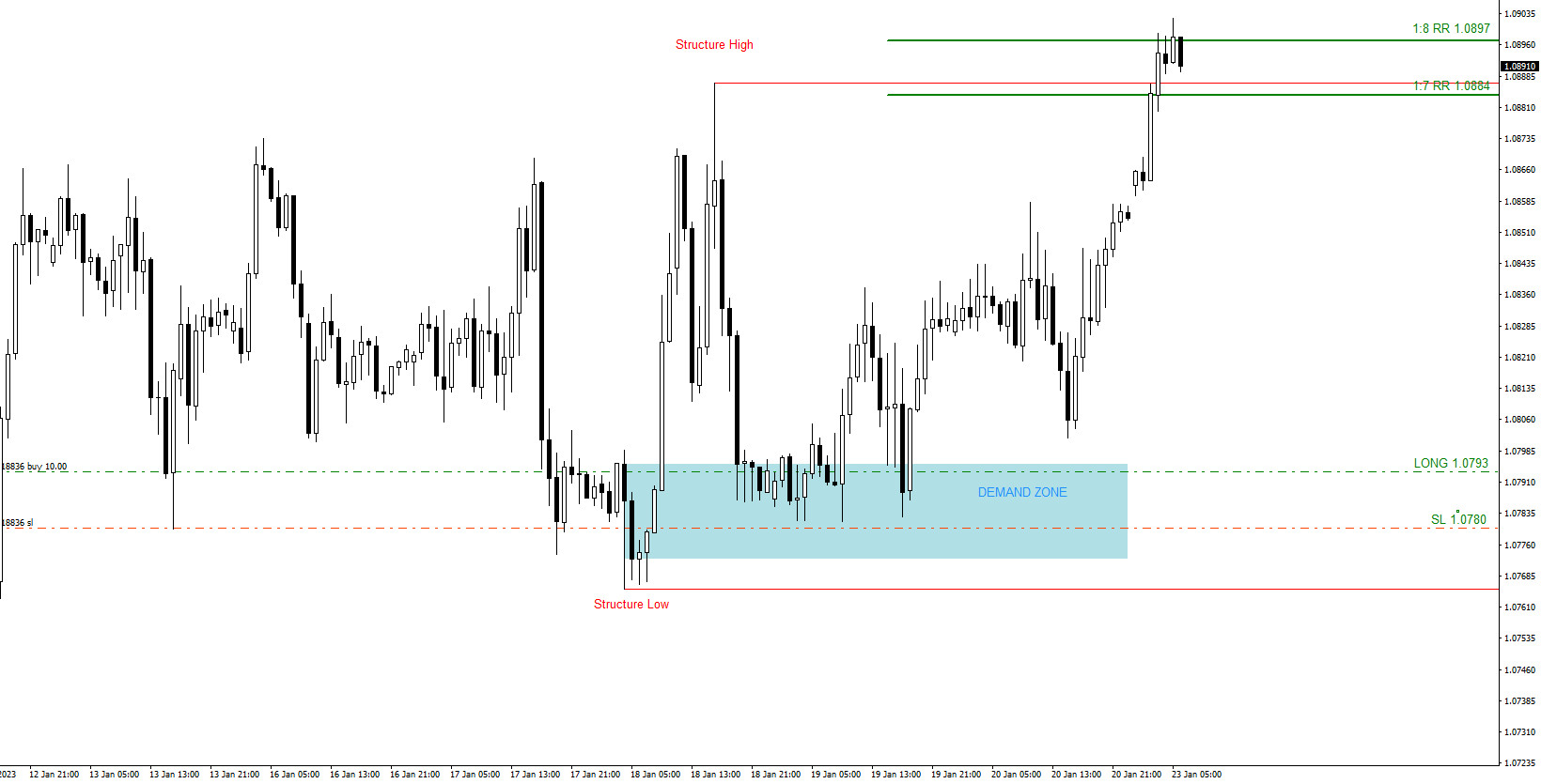 The pair moves higher and on January 22 2023 EURUSD hits the target at 1.0897 from 1.0793 entry for a +104 pip move and a 1:8 Risk/Reward winning trade. Eventually the pair later continued higher to tag the 1:10 RR maximum target level but I was happy to close out and take profit at the 1:8 RR target level.