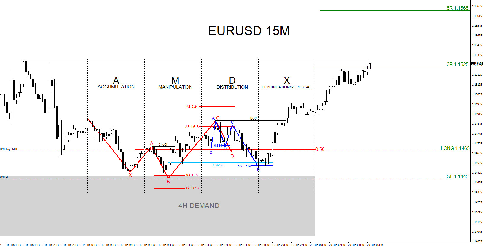 Entered the BUY (Green) trade June 19 2025 at 1.1465 with a 20 pip stop loss at 1.1445 and several hours later EURUSD continues higher and the 1:3 Risk to Reward target hits at 1.1525 where I closed the buy trade for +60 pips +3% gain (Risking 1% on every trade).