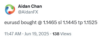 On June 19 2025 I posted on social media @AidanFX the EURUSD BUY setup with entry, stop loss and target.