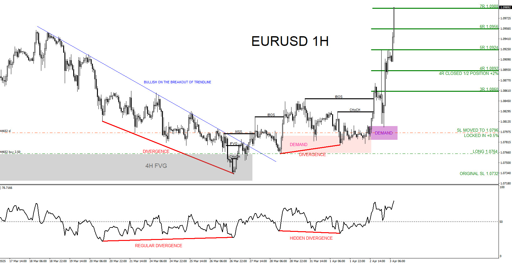 Entered the BUY trade March 27 2025 at 1.0764 with a 32 pip stop loss at 1.0732. Closed 1/2 position at the 4R 1.0892 target for +128 pips +2% gain and on April 3 2025 EURUSD continued higher and hit the 7R 1.0988 target where I closed the 2nd 1/2 for +224 pips +3.5% gain. Combined +5.5% total gain. (Risking 1% on every trade)