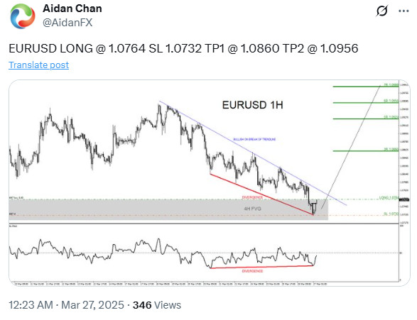 On March 27 2025 I posted on social media @AidanFX the EURUSD bullish buy setup chart with entry, stop loss and targets.