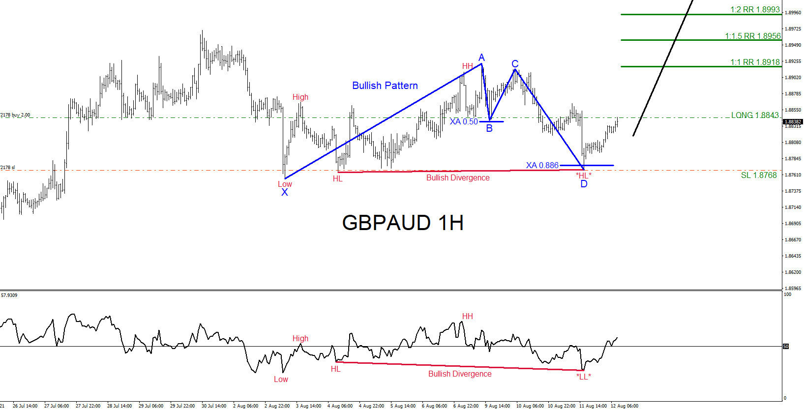 Seeing that GBPAUD was responding to the bullish patterns and pushing higher a trade was entered August 12 2021 at 1.8843 with Stop Loss at 1.8768 and targeting the first target at 1.8918 (minimum target) and the second target at 1.8993.