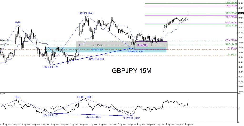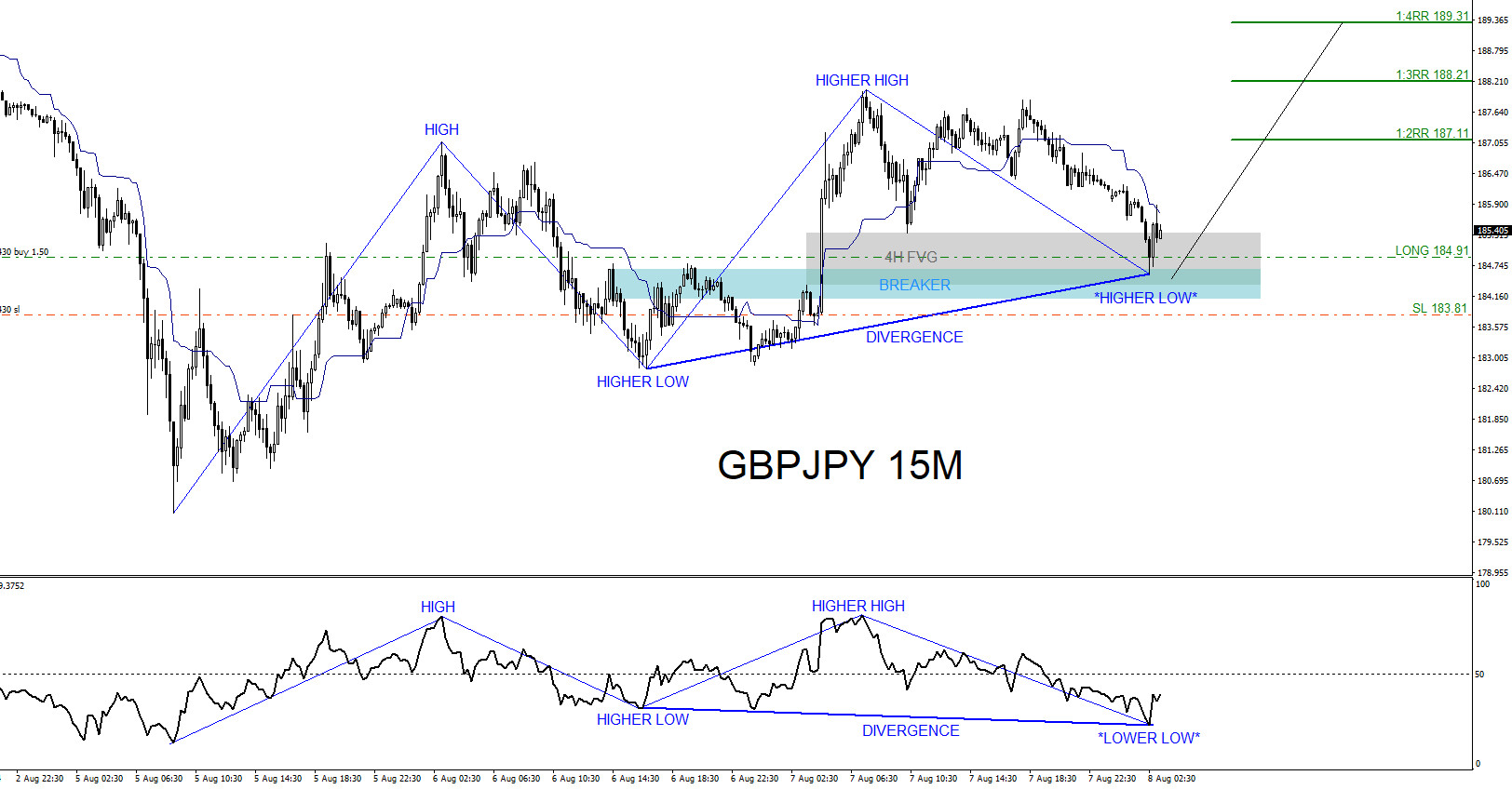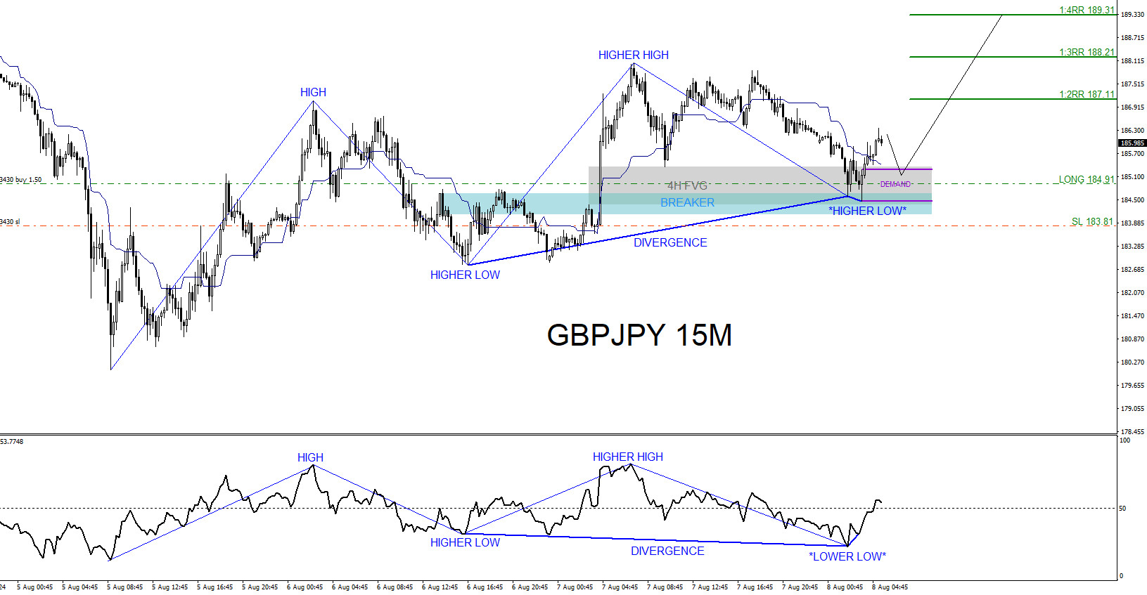 On August 7 2024 I posted on social media @AidanFX the BUY setup ” BOUGHT/LONG GBPJPY at 184.91 Stop Loss 183.81 Target 187.11.” I also posted the 15 minute chart explaining the pair tapped into bullish zones (Gray 4 hour FVG/Blue 15 minute bullish breaker block) where buyers were waiting to push the pair higher. Added confluence was the bullish price and indicator divergence pattern forming in the zones. All this combined allowed me to squeeze the BUY/LONG trigger with confidence.