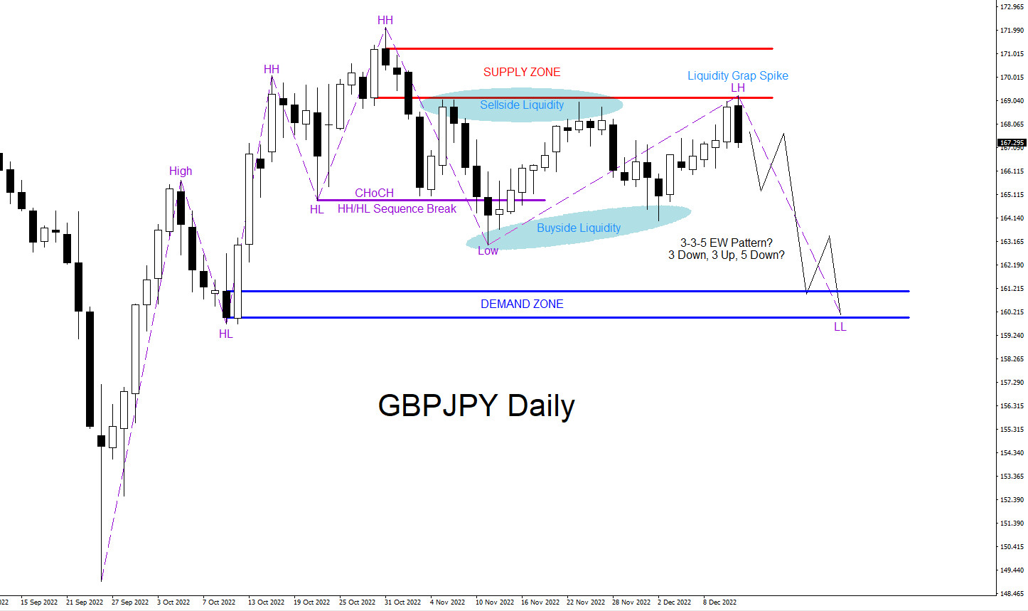 On December 13 2022 I posted the GBPJPY Daily chart on social media @AidanFX . On December 15 2022 I also posted the SELL entry at 168.45 with Stop Loss at 168.85 and Target at 166.45 (1:5RR) minimum 160.45 (1:20RR) maximum.