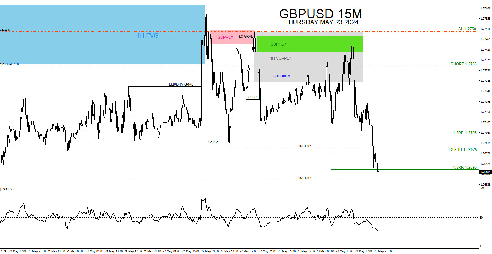 On May 22 2024 I posted on social media @AidanFX the GBPUSD SELL setup chart. The pair was trading in a range zone with 1 hour and 15 minute supply/sell zones above the equilibrium level. Chart illustrated for traders to wait for price to tap these zones before squeezing the sell trigger. Pending SELL order was placed at 1.2735 with stop loss set at 1.2750.