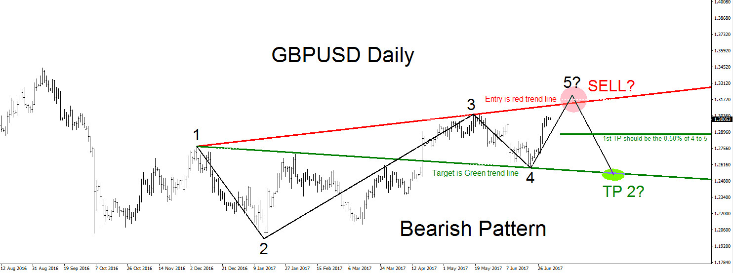 GBPUSD Bearish Scenario: A bearish pattern can be seen for another possible move lower but has yet to trigger sells. If looking to sell GBPUSD traders should be patient and wait for price to make a move higher and hit the red entry trend line and possibly terminate point 5 with a reversal lower. If price hits the red trend line traders should also be watching possible candlestick trend reversal signals (Harami, Dark Cloud, Bearish Engulfing, Shooting Star, etc.) for more confirmation.