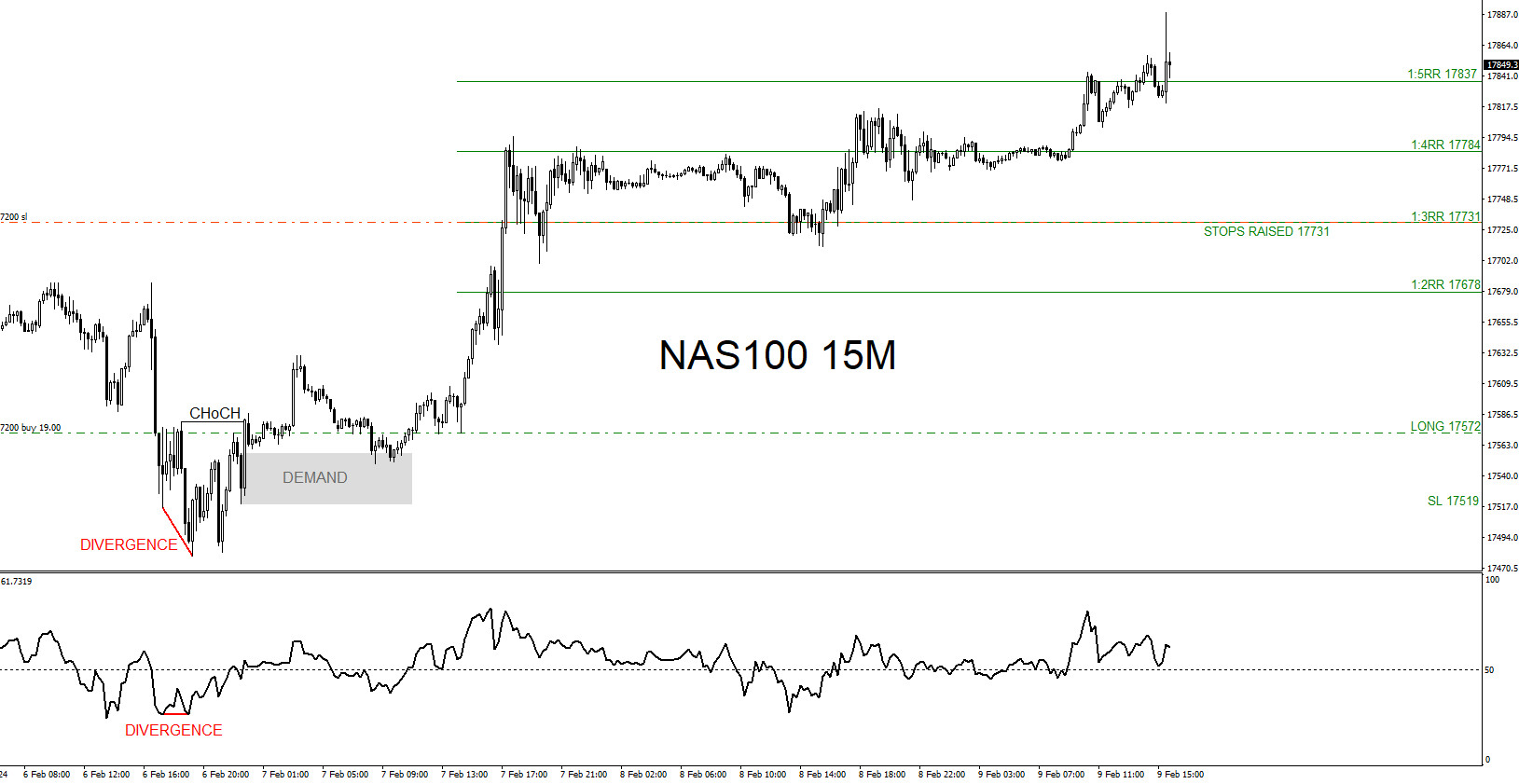 On February 7 2024 the Nas100 (Nasdaq) was showing signals that the index would extend higher. Below I will explain the reasons why I entered the BUY/LONG trade.