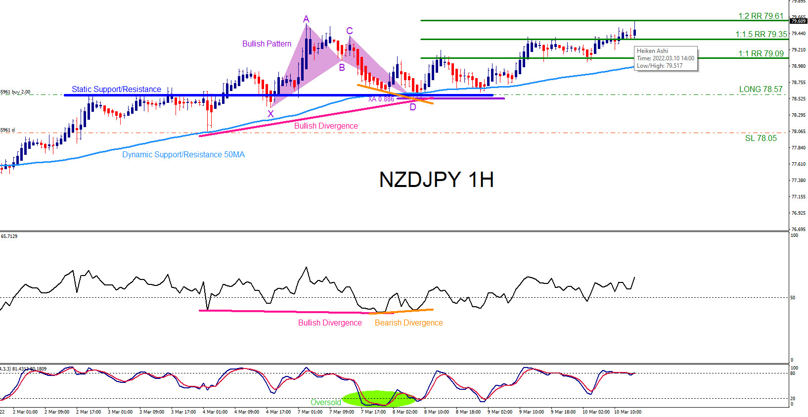 Entered the BUY trade at 78.57 with Stop Loss at 78.05 and Target at 79.61 (1:2 RR). NZDJPY moves higher and on March 10 2022 price hits the proposed 1:2 RR target at 79.61 from 78.57 for +104 pips (+2% gain risking 1% on every trade)