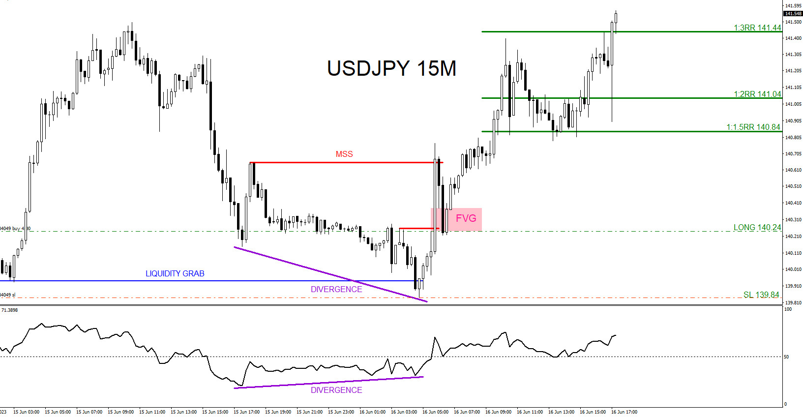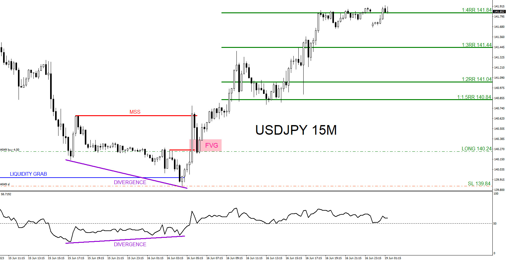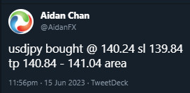 On June 15 2023 I posted on social media @AidanFX “Bought USDJPY at 140.24 Stop Loss at 139.84 Target/TP at 140.84 – 141.04 area“