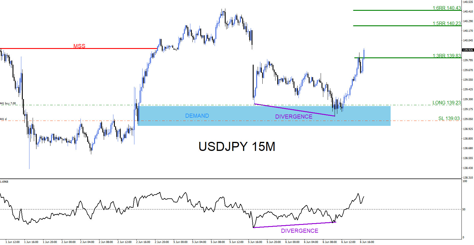 On June 6 2023 I posted on social media @AidanFX “LONG/BUY USDJPY at 139.23 Stop Loss at 139.03 Target/TP at 139.83 (1:3RR)“