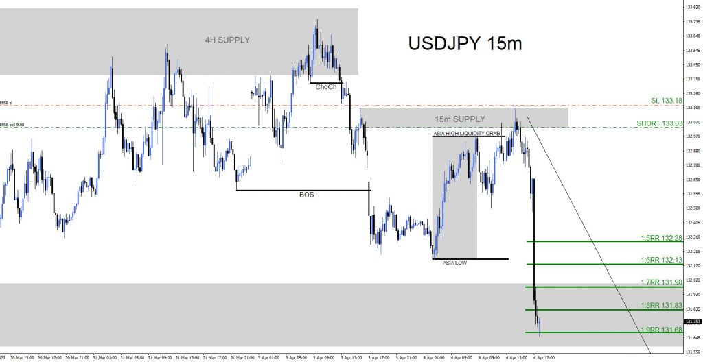 On April 4 2023 I posted on social media @AidanFX ” USDJPY will look for sells against 133.18 stops targeting the 132.28 – 131.98 area.”