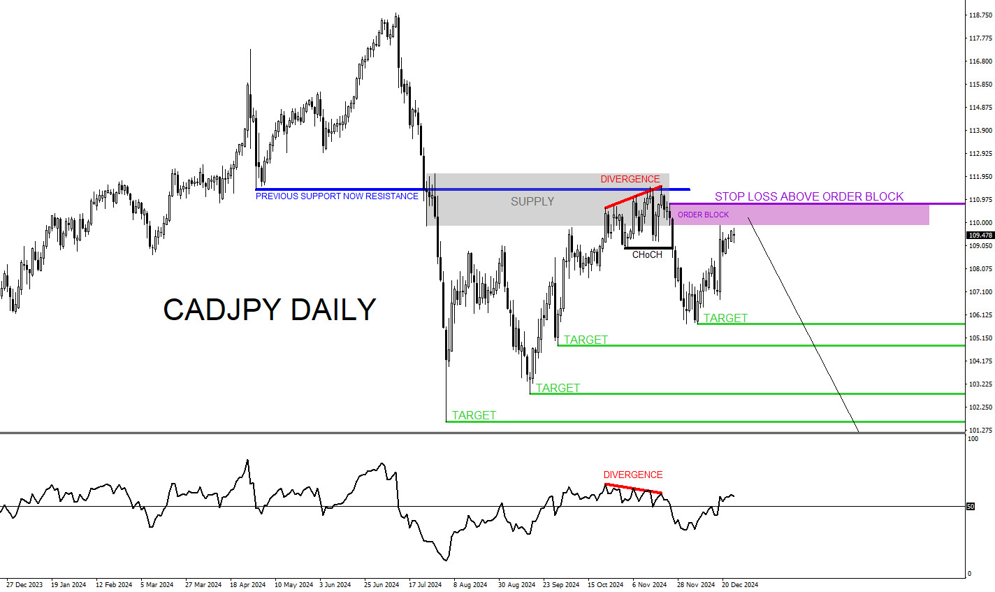 The chart below of the CADJPY pair shows the pair reacted lower from a bearish supply zone (Gray) and also reacted lower from a clear visible blue resistance level/previous support. A bearish divergence pattern (Red) also formed in the same zone/level signalling for a possible continuation lower. Price has since moved lower from supply zone signalling a bearish change of character (Black CHoCH). If looking to trade CADJPY, traders should be patient and wait for price to make a small push higher. Wait for price to at least enter the Daily bearish order block (Purple). When price enters the order block traders should switch to lower time frames, like the 1 Hour or 15 Minute chart, and look for price to start showing that it wants to shift lower then aim for the target levels below (Green). Only time will tell what CADJPY will do but for the meantime we expect more downside as long as price remains below the November 20 2024 divergence high.