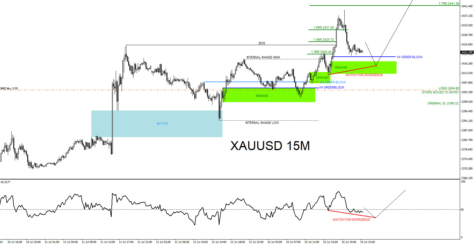 XAUUSD 15 Minute Chart July 15 2024 (1:5 RR Target HIT)