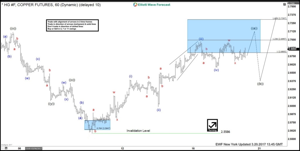 In this technical blog, lets take a quick look at the 1 hour Copper Elliott wave view from March 09 lows. In which the the metal was showing 5 waves bounce from March 09 (2.5593) low & the bounce was impulsive rather then corrective sequence. Thus suggesting the cycle from (2.5593) low could be following the Elliott wave Zig-zag pattern. Where the cycle from (2.5593) low ended at March 20 peak (2.6979) that we have labelled as Minute wave ((a)) of the zig-zag pattern. According to Elliott wave theory Zigzag is a 3 wave structure having internal subdivision of (5-3-5) swing sequence. The internal oscillations are labeled as A, B, C where A = 5 waves, B = 3 waves and C = 5 waves. This means that A and C can be impulsive or diagonal waves. However the A and C waves must meet all the conditions of wave structure 5, such as: having an RSI divergence between wave subdivisions, ideal Fibonacci extensions, ideal retracements etc. The cycle from (2.5593) low to (2.6979) was in 5 waves sequence, then the 3 wave dip in Minute wave ((b)) was expected to hold above (2.5593) low for next leg higher in Minute ((c)) leg higher into the direction of previous wave ((a)) or for 3 swings bounce at least.