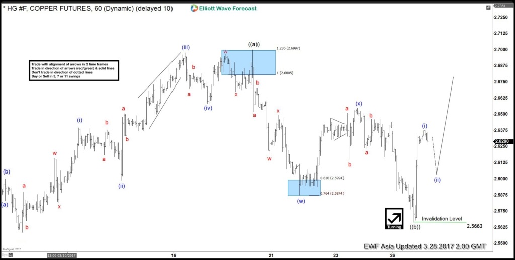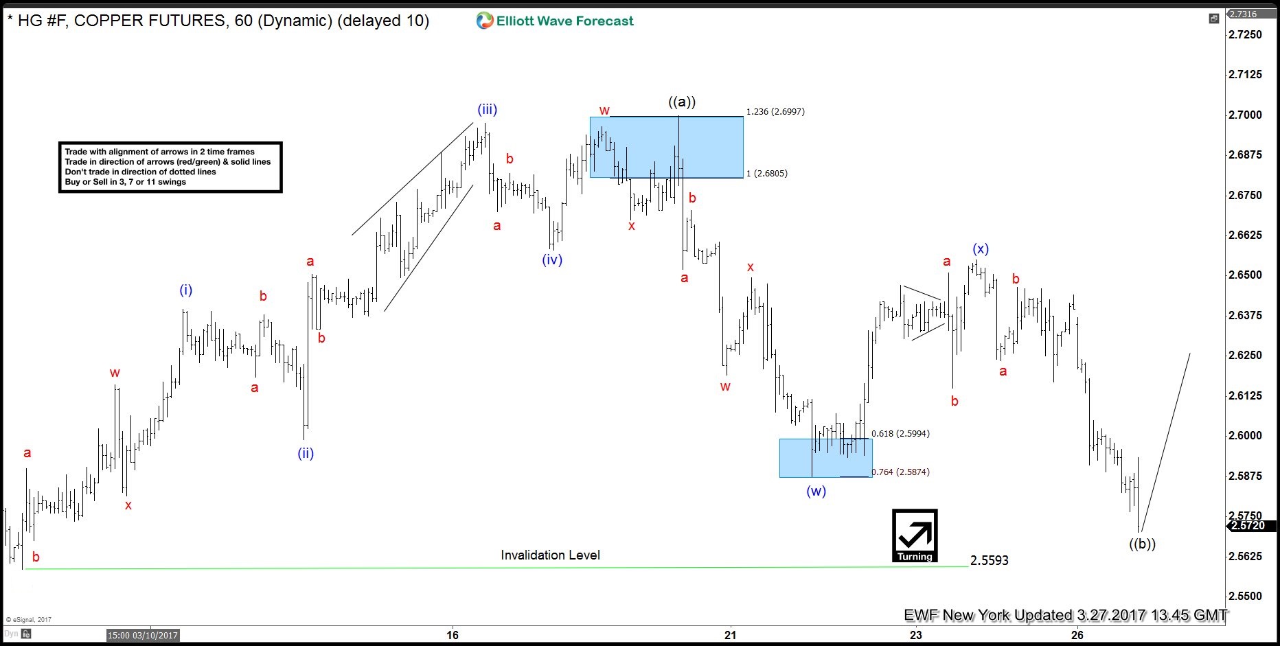Below is the 1 hour March 27 NY updated chart showing the pullback happening in the metal within Minute wave ((b)), as Elliott wave double three structure from (2.6979) peak, where first leg lower ended in Minutte wave (w) at (2.5863) & Minutte wave (x) at (2.6544), then based on the correlations with US dollar & other commodities i.e OIL, Natural GAS & Metals, Copper was expected to stay above (2.5593) invalidation level.