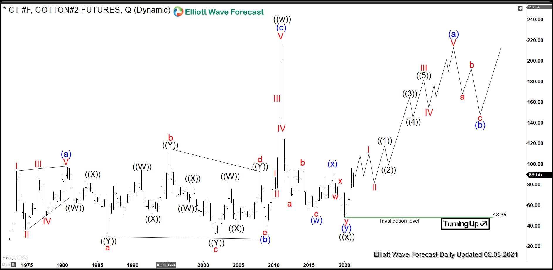 The quarterly chart below shows the cotton front contract CT #F at NYBOT. Historically, cotton has been traded at New York Cotton Exchange since 1870. Later, it moved to NYBOT and the chart data shows cotton prices from 1972 on. From the lows, the prices have developed a corrective cycle higher in black wave ((w)) of a grand super cycle degree. One can see it as an Elliott Wave zigzag pattern. Hereby, blue wave (a) has demonstrated a leading diagonal structure and has ended in 3rd quarter of 1980. From there, a running triangle in wave (b) has caught the market in range bound oscillations until the 4th quarter of 2008. From there, the sideways market has resolved into an acceleration higher within an impulsive move in wave (c). Hereby, cotton has made 6x in prrice and saw the all-time highs in the 1st quarter of 2011 at 219.70.