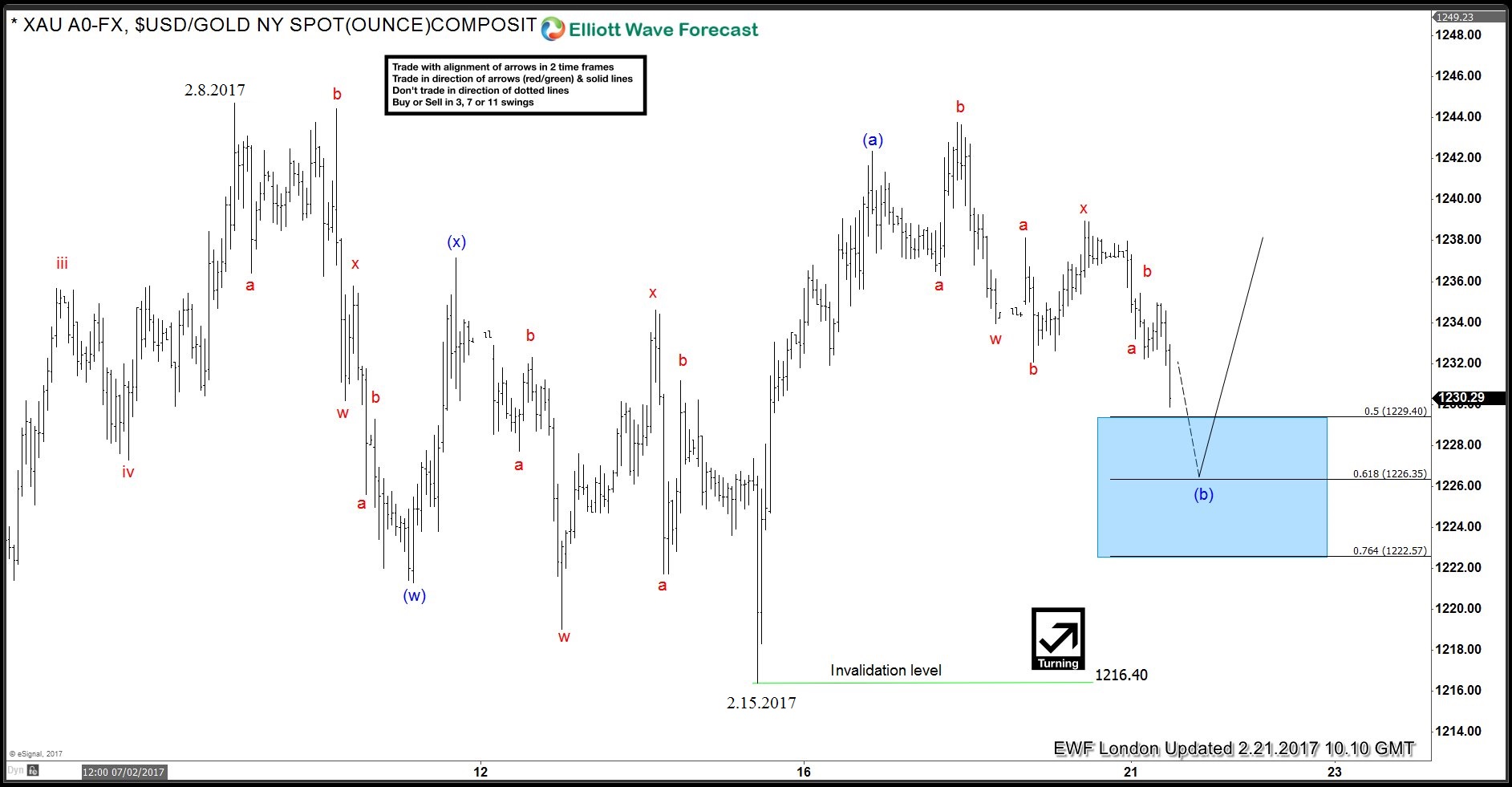 In this Technical blog, we are going to take a quick look at the Gold 1 hour chart from Feb 21,2017. In which the bounce from 2/15/2017 low (1216) appeared to be in 5 waves sequence & the bounce was impulsive rather then corrective sequence. Thus suggesting the cycle from 1216 low could be following the Elliott wave Zig-zag pattern. Where the cycle from 1216 low ended at 1242 that we have labelled as wave (a) of the possible zig-zag pattern. According to Elliott wave theory Zigzag is a 3 wave structure having internal subdivision of (5-3-5) swing sequence. The internal oscillations are labeled as A, B, C where A = 5 waves, B = 3 waves and C = 5 waves. This means that A and C can be impulsive or diagonal waves. The A and C waves must meet all the conditions of wave structure 5, such as: having an RSI divergence between wave subdivisions, ideal Fibonacci extensions, ideal retracements etc. As the cycle from 1216 low to 1242 highs was in 5 waves swing sequence, our Strategy was to buy the 3 swing pullback in wave (b) in between 50-61.8% Fibonacci retracement area between 1229- 1222 (highlighted with a blue box) for the next leg higher into the direction of previous wave (a) or for 3 swings pullback at least to allow our members at elliottwave-forecast to create a risk free position at least.