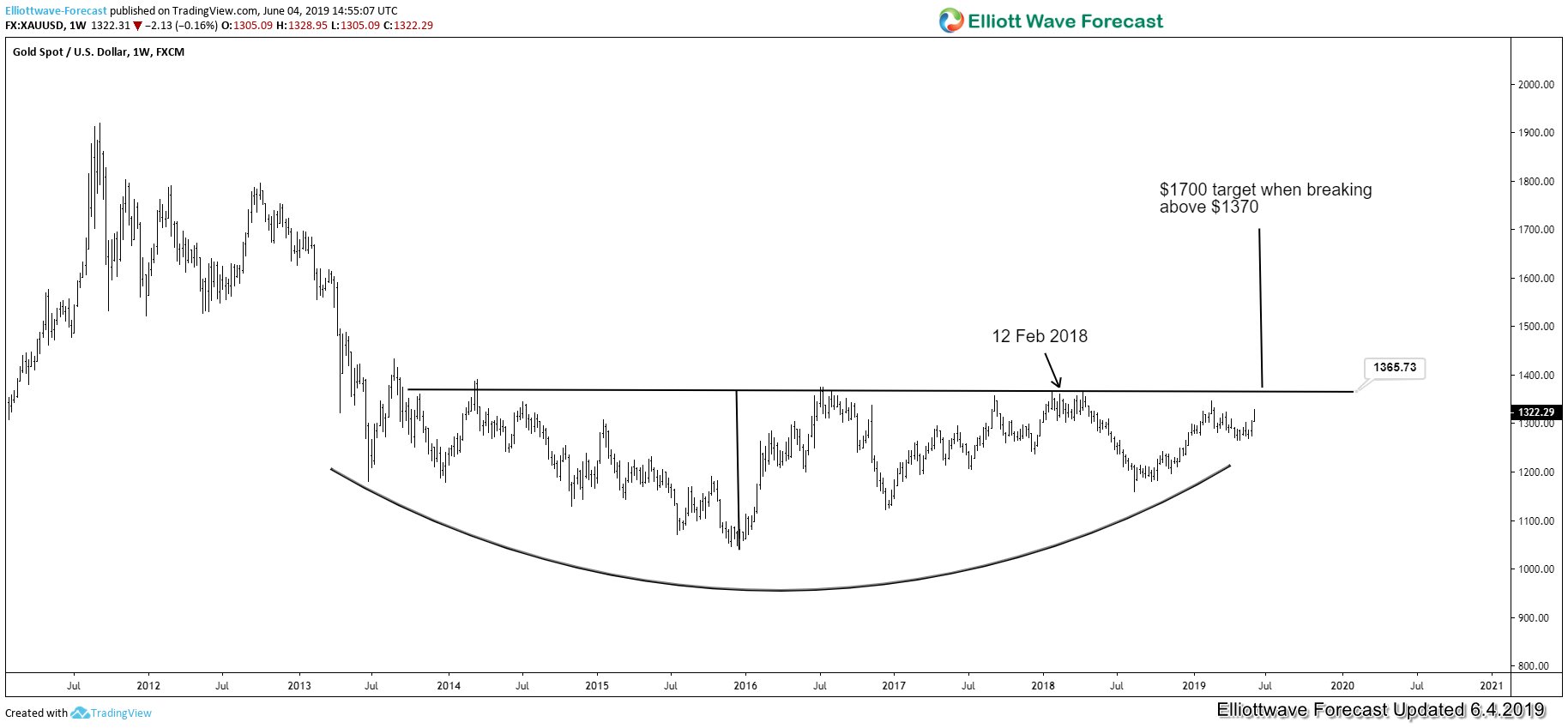 The yellow metal is showing a rounded bottom pattern and it’s been building a base for the last 5-6 years. If Gold can break above the neckline, it will likely cause money to flow aggressively into gold and related. The first target of Gold if it is able to break above the neckline will be $1460 – $1540 area.