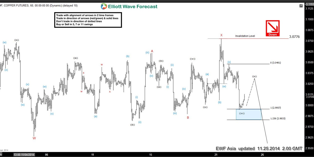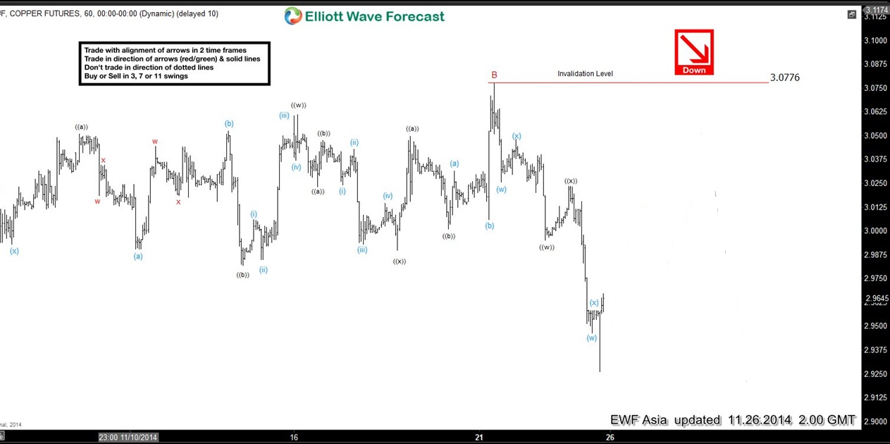 The video below was posted at Elliottwave-forecast.com on November 25. In the video we explain to the world that HG (Copper) will continue lower according to our analysis and we also recommended to SELL Copper on the bounce with invalidation level at 3.0776