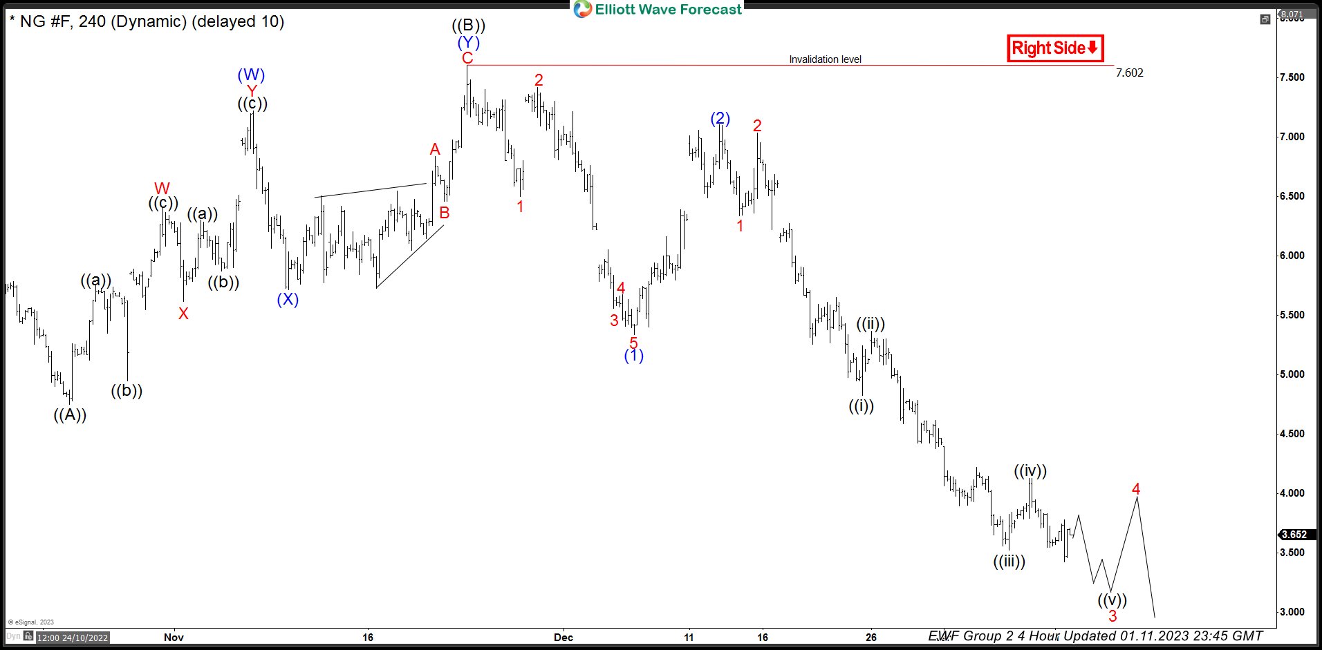 Chart below shows Natgas initial decline from 08.23.2022 peak was an Elliott Wave Impulse within which wave (1) ended at 9.05, wave (2) ended at 9.682, wave (3) ended at 6.305, wave (4) ended at 7.188 and wave (5) ended at 4.75. Since we expected this decline to be part of a correction so we labelled it wave ((A)) anticipating the correction to unfold as a Zigzag Elliott Wave structure. Impulsive decline from 08.23.2022 peak was followed by a corrective recovery to 7.604 which we labelled as wave ((B)) and then the decline resumed again. We expected some more downside to complete wave (1) before a bounce in wave (2) to fail below 7.604 high for extension lower in wave (3) of ((C)).