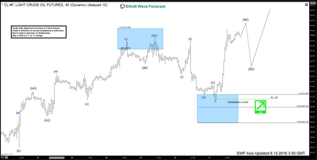 The CL #F Light crude oil futures chart below shows preferred Elliott wave forecast from August 11.2016. It suggests the cycle from the 39.19 (8/3) low completed at 43.39 labelled red wave W. After that price pulled back in 3 waves to 42.40 i.e. wave ((a)) and then went on to make a new high above 43.39 high but failed to follow through and started dropping again eventually dropping below wave 42.50 low giving it the look of an expanded FLAT structure. In this case wave ((c)) extended to just short of 2.618 Fibonacci extension of ((a))-((b)) at 41.06 and also reached the 50 -61.8 Fibonacci retracement area of the red wave W. As per the forecast, we already have 5 swing within wave ((c)), there is possibility of another marginal push lower to happen before the next leg higher begins.