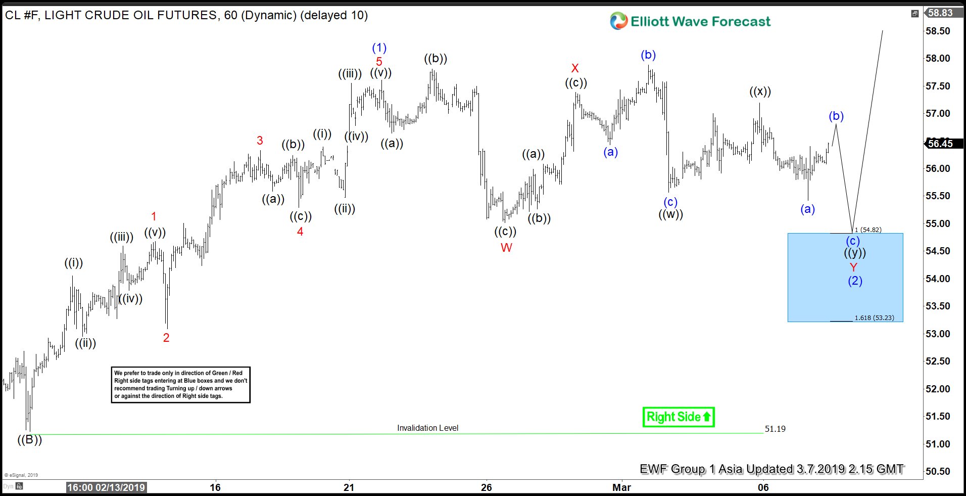 As we can see on the chart below , OIL ended cycle from the 51.19 low and now correcting it. Pull back is unfolding as Double Three – 7 swings structure, labeled as WXY red. As of right now we see pull back incomplete. We are still in Y red leg, when first leg of Y red has unfolded as Irregular Flat, labeled as ((w)) black . Chart is calling for potentially another leg lower toward the blue box area : 54.82-53.23 ( buyers zone). Consequently , we don’t recommend selling OIL and favor the long side from the marked Blue Box area.