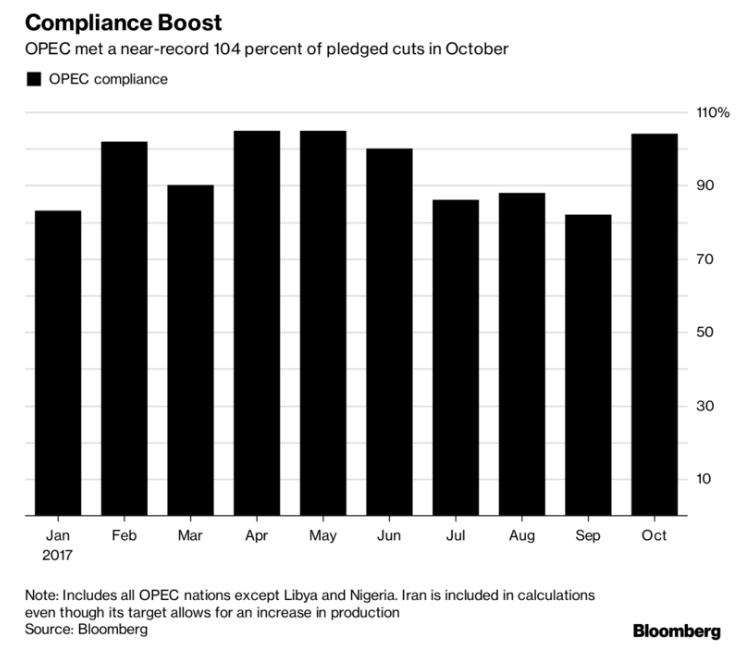 One of the reasons for this success is OPEC members’ compliance to the agreed upon production cuts from last year. In October, the compliance reaches 104% as the chart below shows