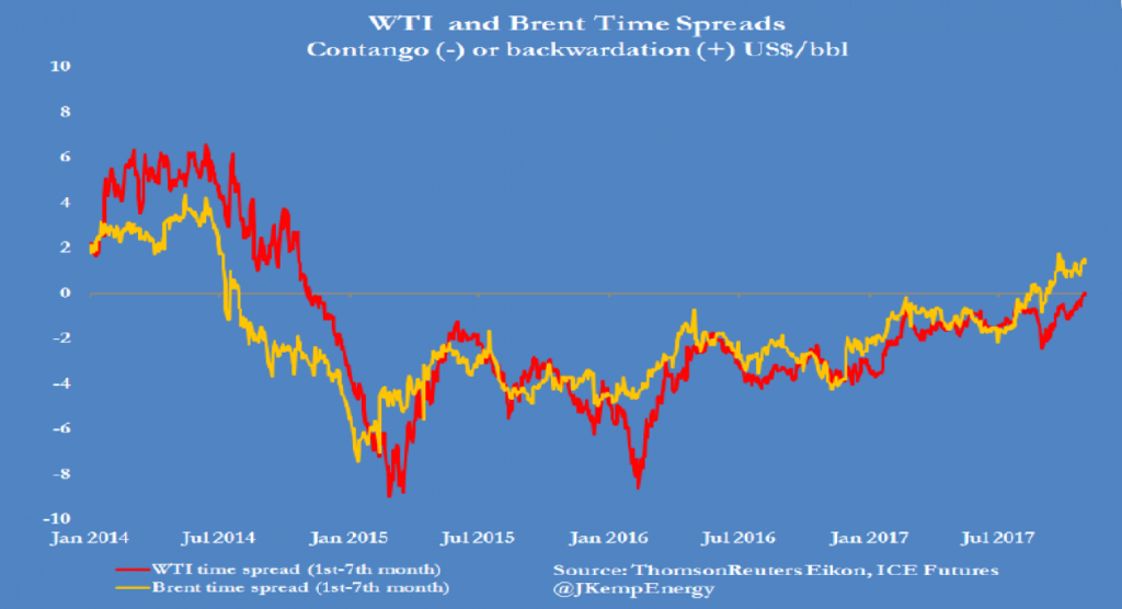 Further evidence that oil market is tightening could be found in oil futures market. Both Brent and WTI are now in the state of backwardation. This is a situation where the current price of oil for immediate shipment is higher than the price for future delivery. It signals that the market is tightening and discourage traders from stockpiling barrels. Conversely, contango is when the futures price of oil is higher than the current spot price. Brent has been in backwardation earlier this year, while WTI just recently moved to backwardation as the chart below shows: