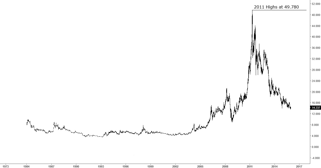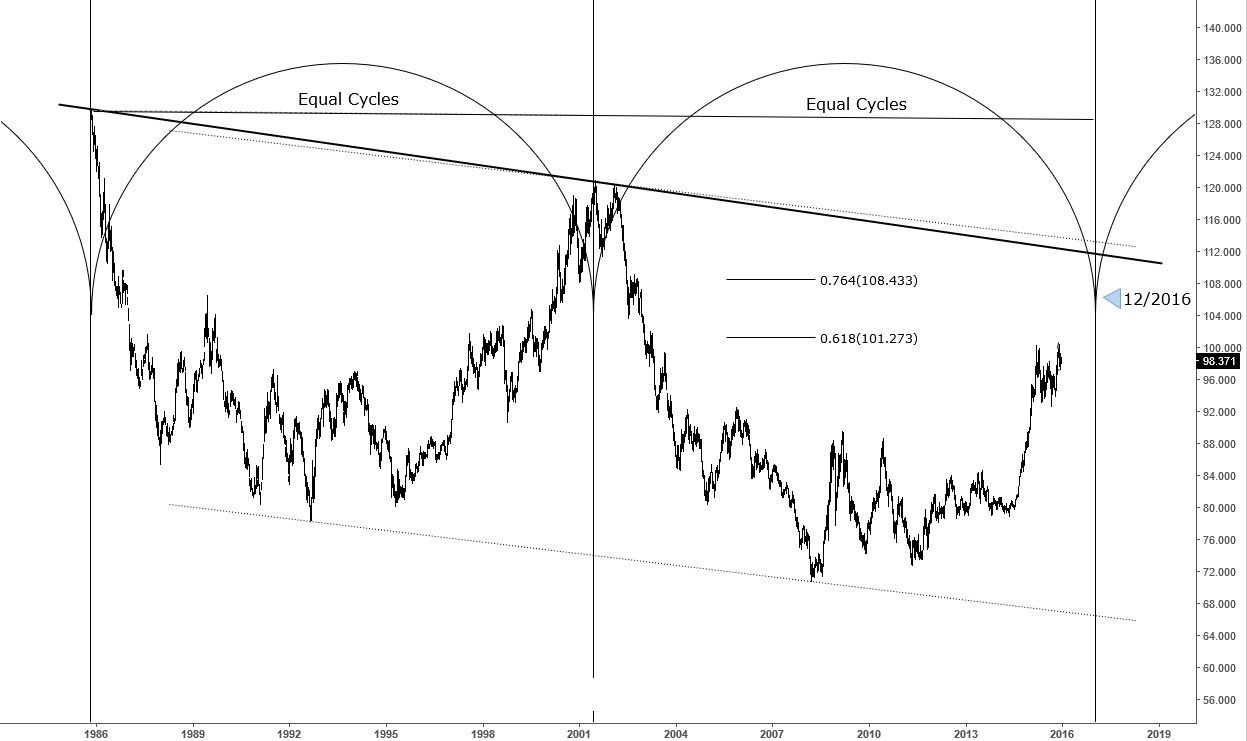 While Precious Metals devaluation has been attributed mostly to the US Dollar:DXY,USDX Rally we believe both metals and the Dollar will reverse within 2016. Below a long term weekly chart of the US Dollar currency indicating that we have a downtrend resistance trend line holding approximately at the 111.00 – 112.00 mark, plus, by the end of 2016 the Dollar will reach equal cycles, cycle from 2001 – 2016 with the cycle during 1986 – 2001.