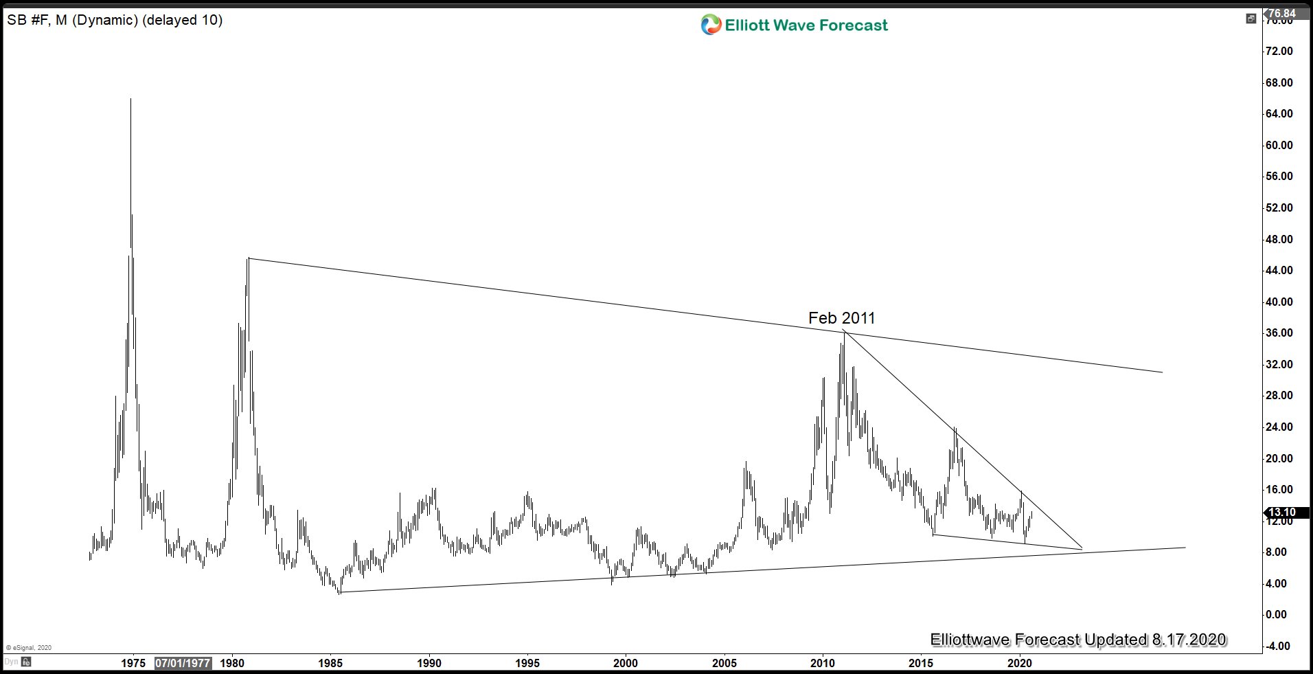 A possible Elliott Wave scenario above suggests the rally from April 28 low is unfolding as a double zigzag Elliott Wave structure. In this scenario, Sugar prices has a target higher towards 14.4 – 15.1 area to complete the sequence from April 28 low. This view is valid as long as wave (X) low pivot at 11.27 remains intact. A more bullish scenario however is possible where the rally from April 28 low is unfolding as an impulse. A more bullish scenario can be considered if Sugar breaks and closes above 2011 bearish trend line shown below