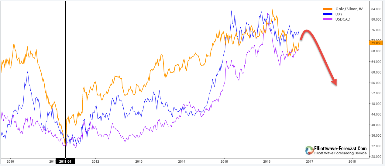 Yesterday the metals took a big hit as silver saw its biggest one day drop ( -5% ) in nearly 20 Months and gold dropped 3% , the strong movement to the downside caused fear for investors and many are switching sides thinking the downtrend has resumed. We need to understand that the market is correlated and it’s just moving in different dimensions so when there is a shift in a major trend it should affect all the instruments , to clarify the situation I added DXY ( US Dollar ) & USDCAD ( Commodity Dollar ) to Gold/Silver ratio chart .