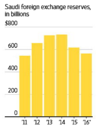 1. Pressure is mounting on Arab Saudi as they fight an expensive war in Yemen and middle class living standard eroded. The middle class no longer received subsidy of electricity and water and the kingdom’s foreign exchange reserves has continued to dwindle from $737 billion to $555 billion as the chart below from WSJ shows: