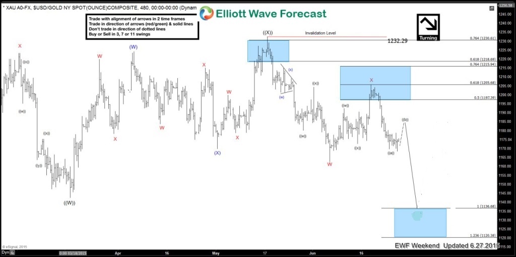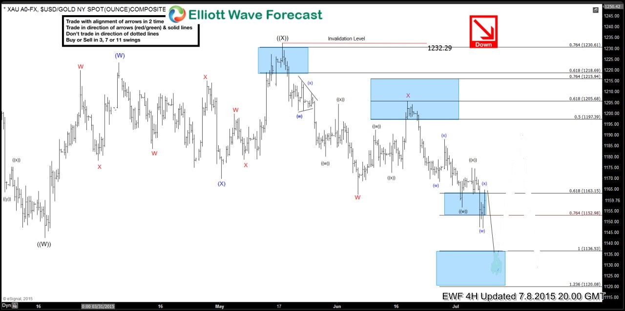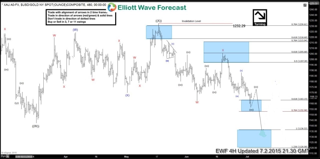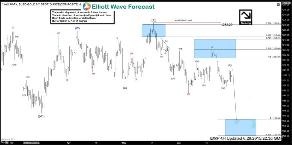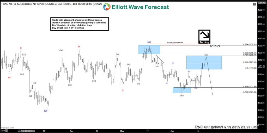 Gold (XAU) topped out on the May 18/2015 high and since then it has reversed and been moving to the down side. We, at Elliottwave-Forecast, strive to keep our members on the right side of the markets and we encourage members to enter trades at precise selling/buying areas. Take a look at the charts below and see how we advised our members to SELL the bounce in 4 different areas.