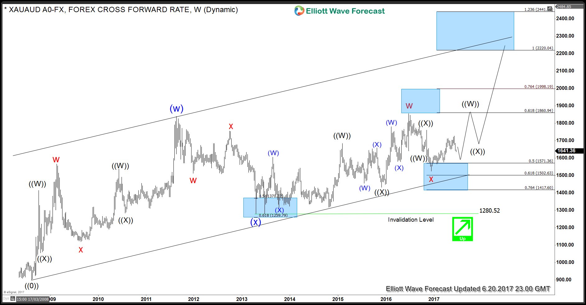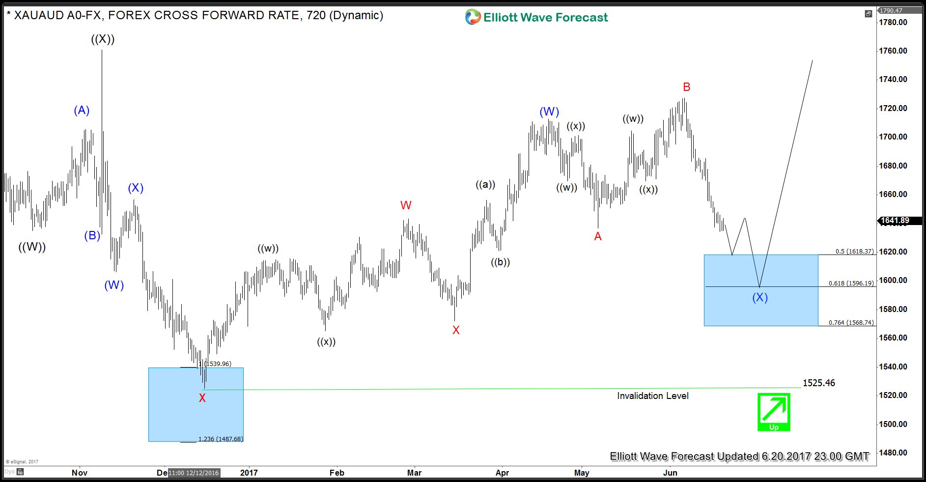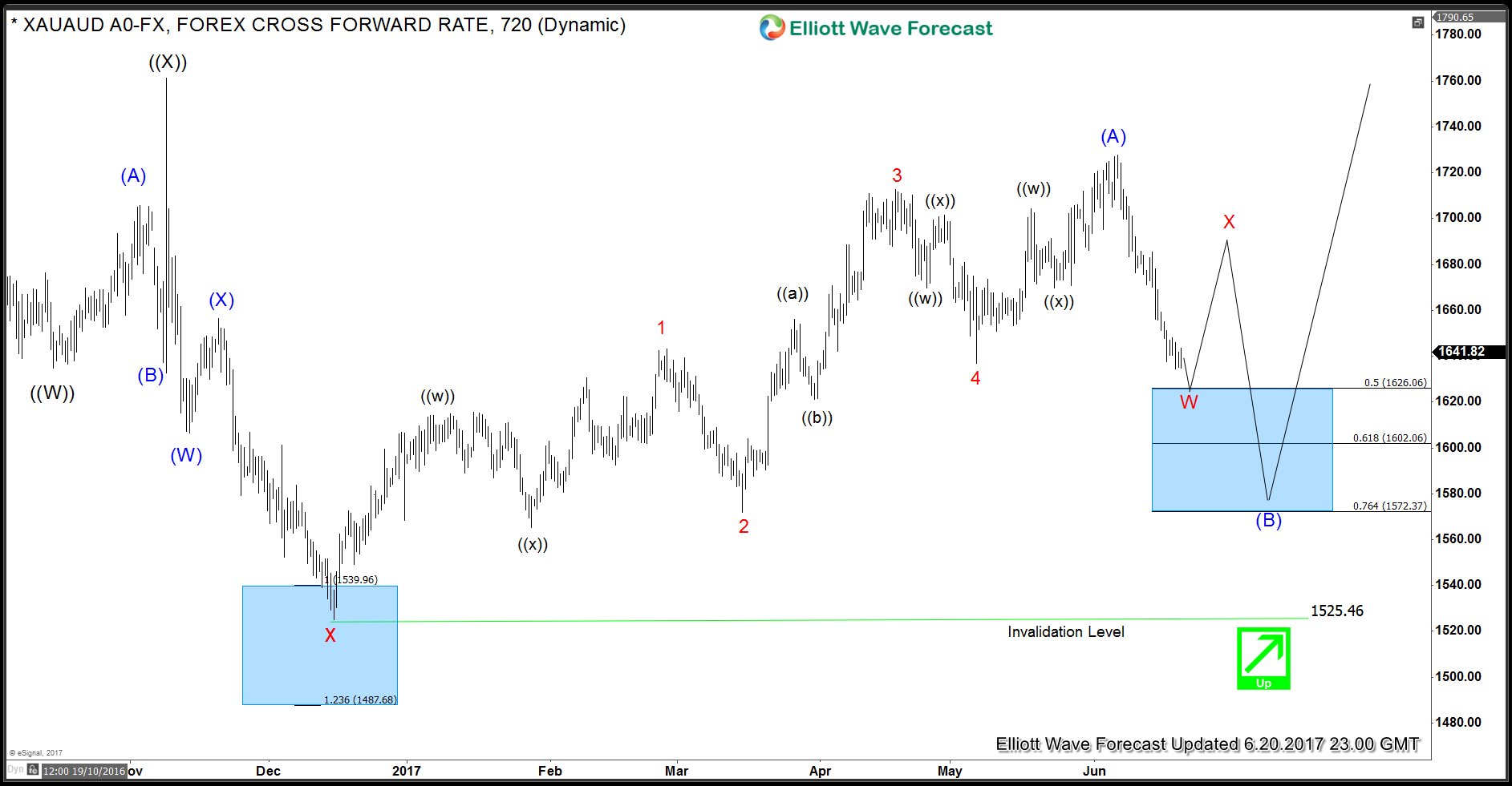 Back in November 2016, we mentioned that Gold should find buyers in 1540 – 1487 area and bounce ideally to resume the rally for new highs or in 3 waves at least. 3 weeks later, XAUAUD reached the mentioned area, it then found a low at 1525 on 12/15/2016 and started rallying. Yellow metal has reached 61.8 Fibonacci retracement (1728) of the drop from June 2016 peak and longs from 1540 should be risk free already. Today, we will take a look at the price action from 12/15/2016 low and the current forecast.